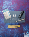 Nowe oryginalne pudełko wraz ze ściereczką oraz olejkiem Pruciak Protector Glide for Herman wraz z dedykowanym śrubokrętem z tytanu produkowanym przez Herman Knives.
