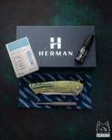 Nowe oryginalne pudełko wraz ze ściereczką oraz olejkiem Pruciak Protector Glide for Herman wraz z dedykowanym śrubokrętem z tytanu produkowanym przez Herman Knives.