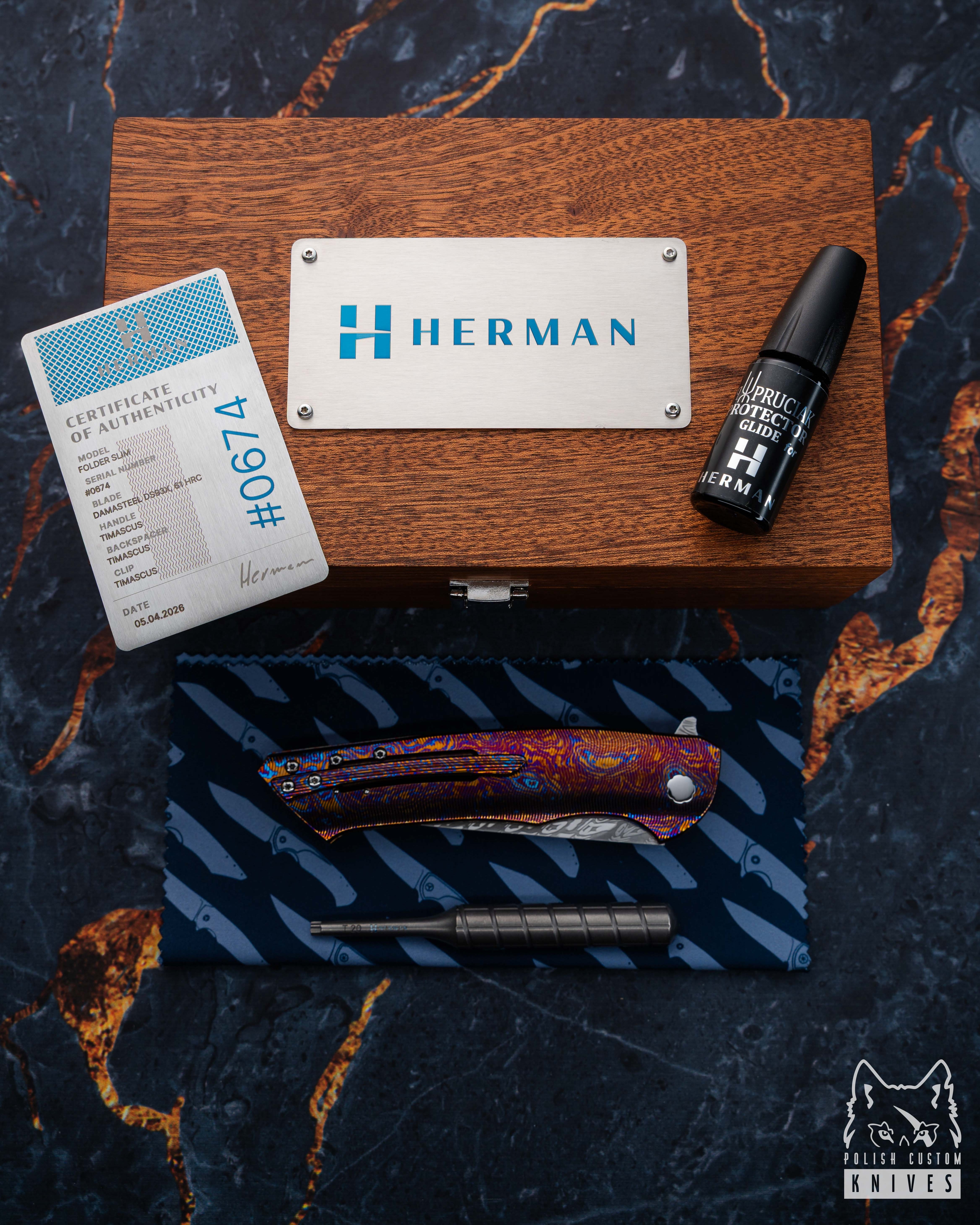 Nowe oryginalne pudełko wraz ze ściereczką oraz olejkiem Pruciak Protector Glide for Herman wraz z dedykowanym śrubokrętem z tytanu produkowanym przez Herman Knives.