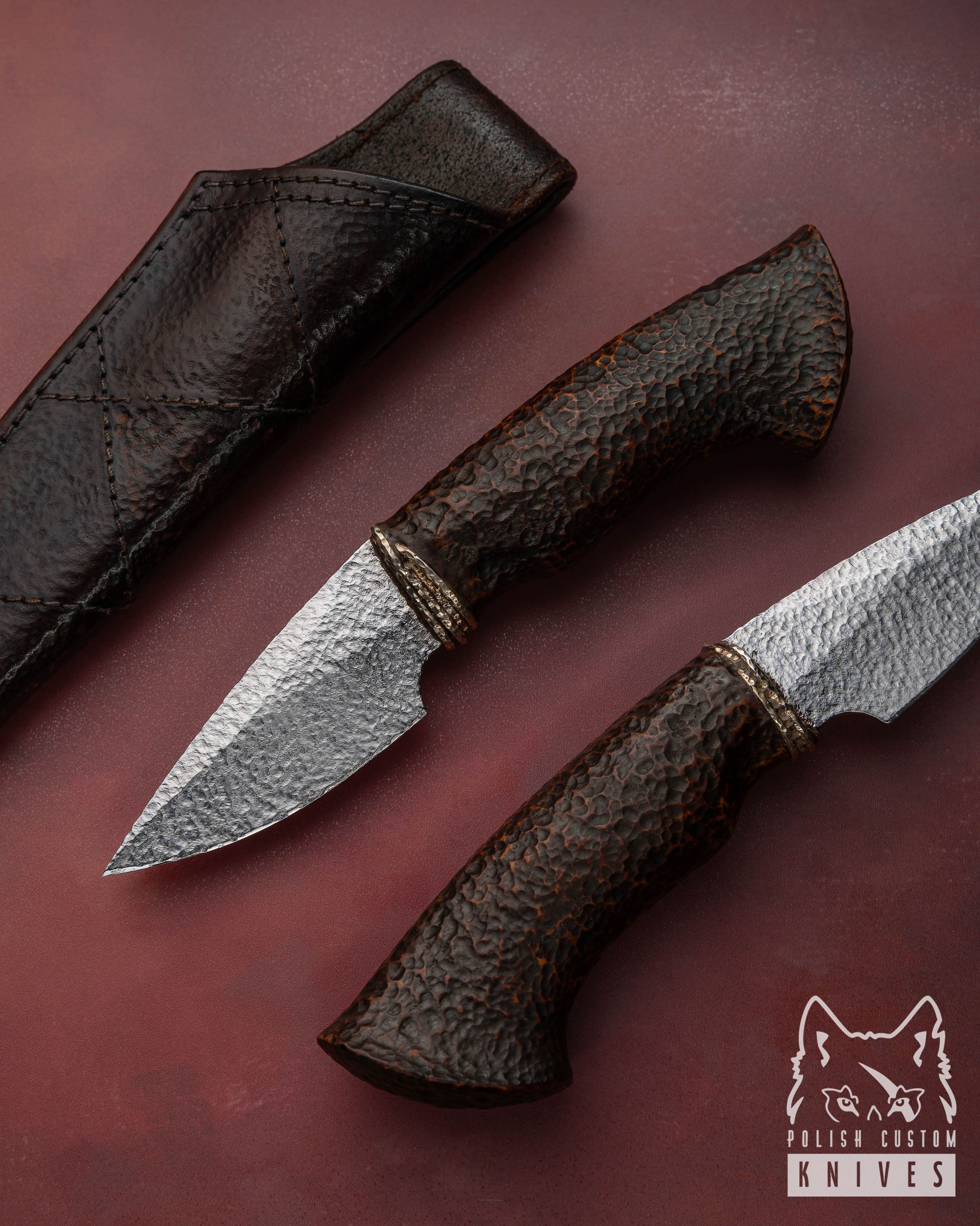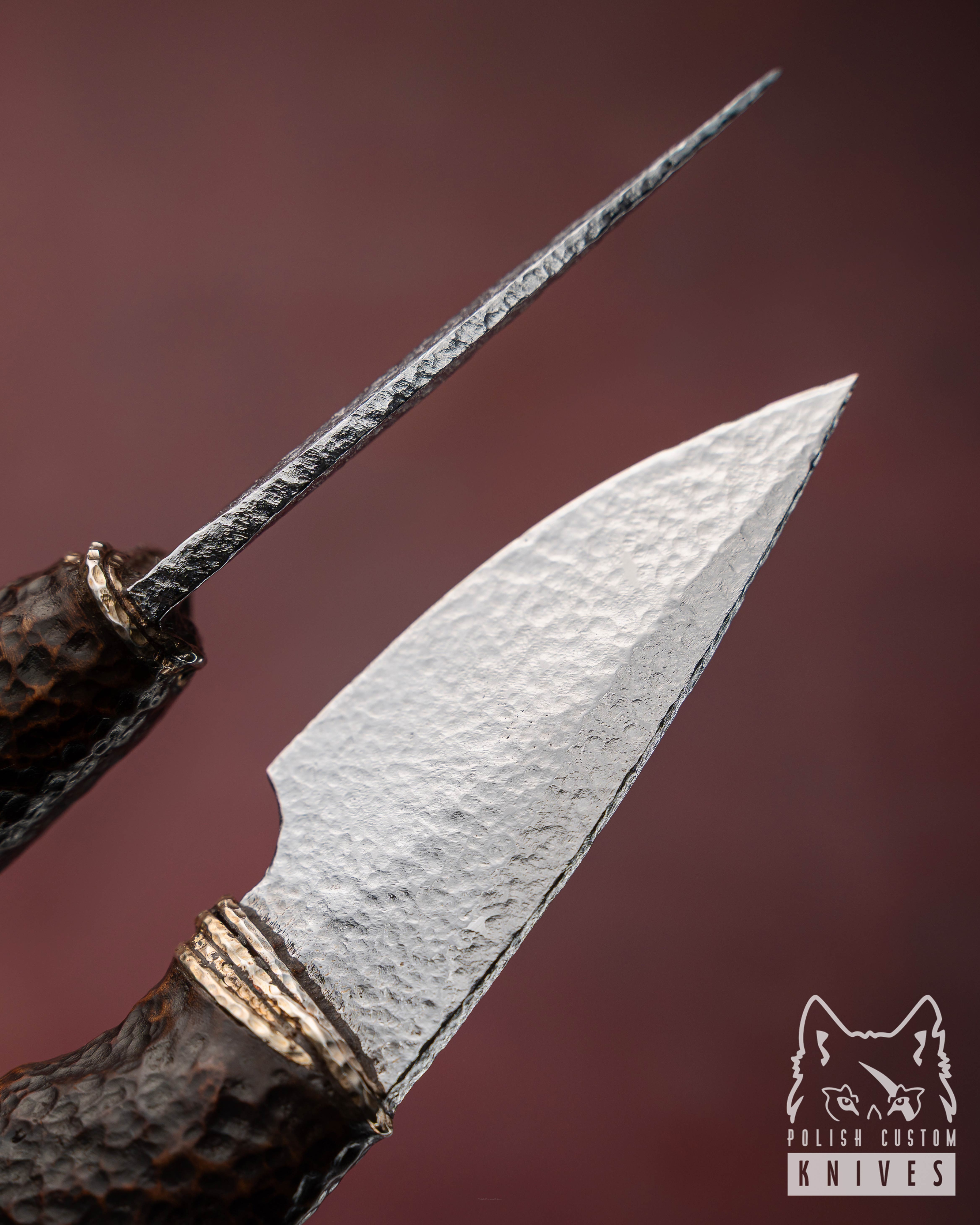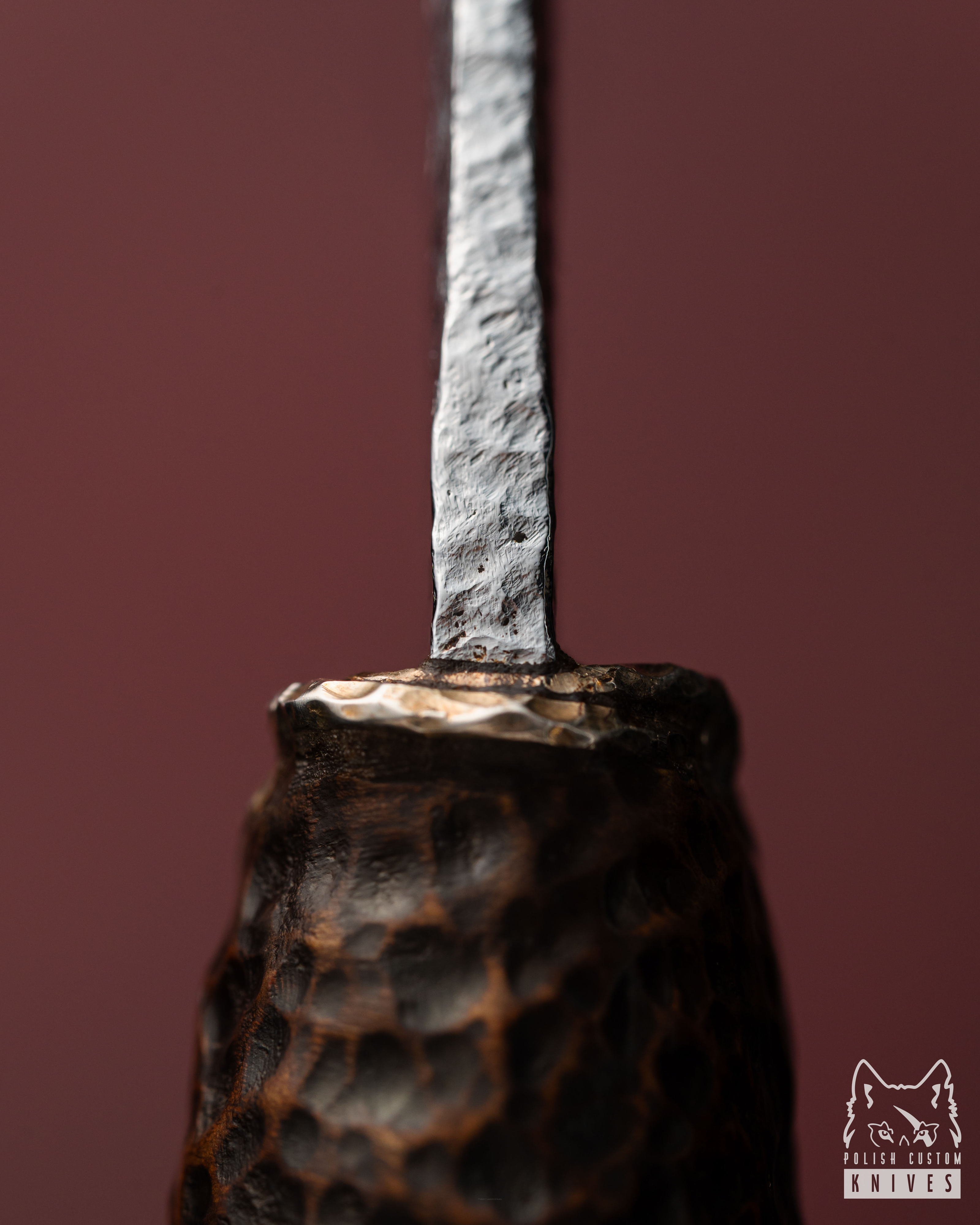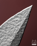 Ostrze wykonane z młotkowanej stali narzędziowej Böhler K110 D2 nadaje całości wyjątkowo mocny wyraz. Jego powierzchnia nie jest gładka ani chłodno perfekcyjna — nosi ślad ręki, narzędzia i procesu, dzięki czemu sprawia wrażenie metalu uformowanego z pełną świadomością jego ciężaru i charakteru. W tej fakturze jest coś organicznego, niemal kamiennego, jakby klinga została wydobyta z dawnej kuźni, w której piękno nie oddzielało się od siły. Prosta, zdecydowana linia ostrza dopełnia ten efekt, budując formę surową, ale niepozbawioną elegancji.
