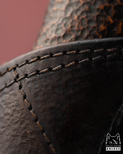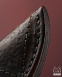 Całość zamknięta została w pochwie ze stabilizowanej, młotkowanej i przeszywanej skóry cielęcej, która doskonale współgra z surowo-szlachetnym językiem tego projektu. To materiał o wyraźnej fakturze i wyjątkowej obecności, idealnie domykający kompozycję opartą na autentyczności, rzemieślniczym kunszcie i nastroju lekkiej tajemnicy. Ashen Feng jawi się jako przedmiot elegancki, poważny i lekko mistyczny — jak relikt stworzony nie dla chwili, lecz dla trwania.