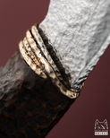 Garda wykończona oplotem ze srebra próby 900 stanowi subtelny, lecz wyraźnie szlachetny akcent. Ten detal nie dominuje formy, lecz ją spaja, wprowadzając nutę dawnej elegancji i dyskretnego blasku. W zestawieniu z młotkowaną powierzchnią ostrza i rękojeści srebro działa jak precyzyjnie dobrane dopełnienie — ciche, ale znaczące, podkreślające ekskluzywny charakter noża.