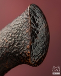 Rękojeść z młotkowanego korzenia drzewa egzotycznego wnosi do projektu wyrazistą głębię i szlachetną nieregularność. Jej ciemna, bogata struktura przywołuje skojarzenia z powierzchnią starego drewna ukształtowanego przez czas, ogień i dotyk. To materiał, który wydaje się żyć własnym rytmem, zachowując naturalny charakter, a jednocześnie idealnie wpisując się w artystyczną wizję całości. Dzięki temu Ashen Feng nabiera wrażenia artefaktu — przedmiotu z pogranicza natury, rzemiosła i symbolu.