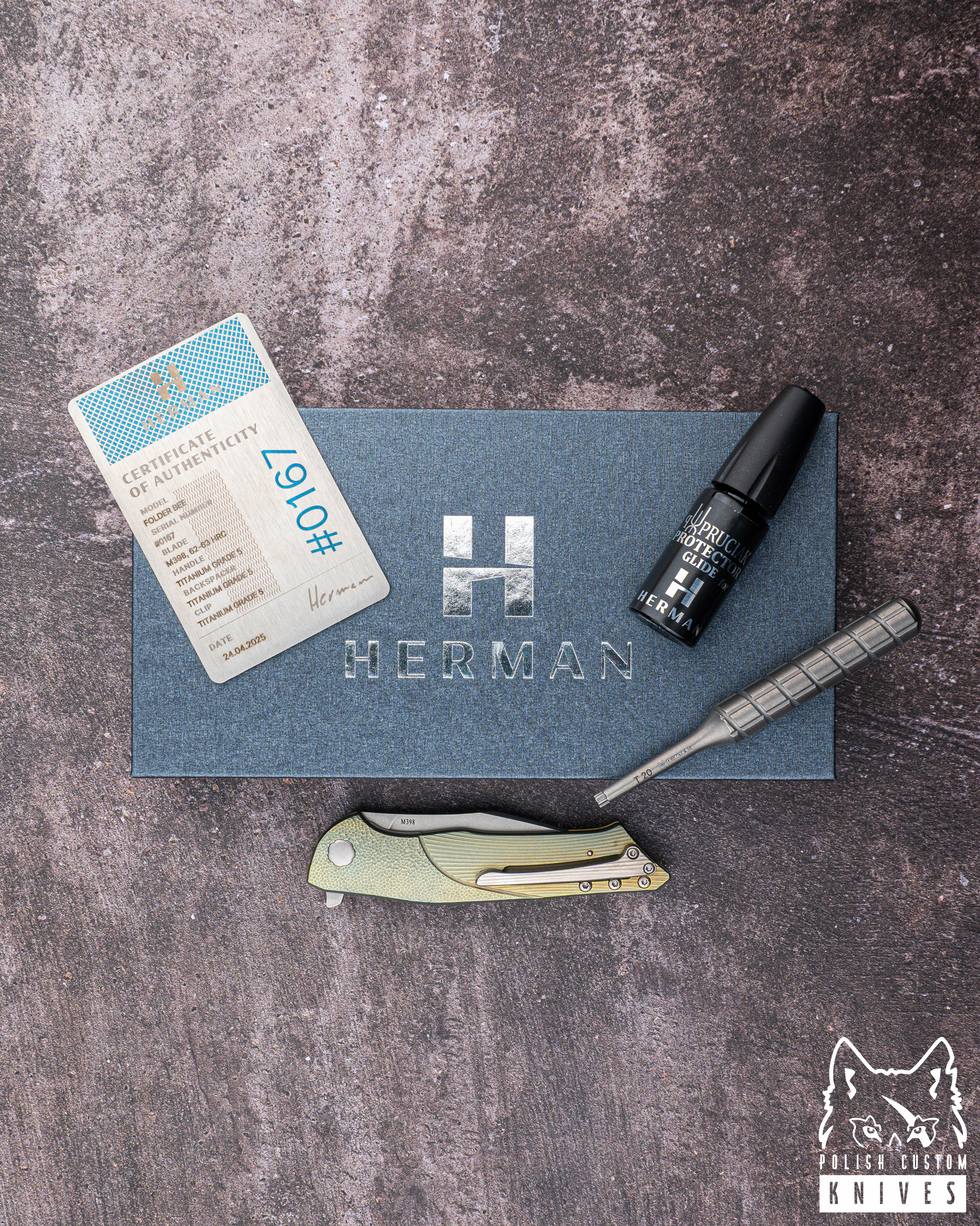 Nowe oryginalne pudełko wraz ze ściereczką oraz olejkiem Pruciak Protector Glide for Herman wraz z dedykowanym śrubokrętem ze stali nierdzewnej produkowanym przez Herman Knives.