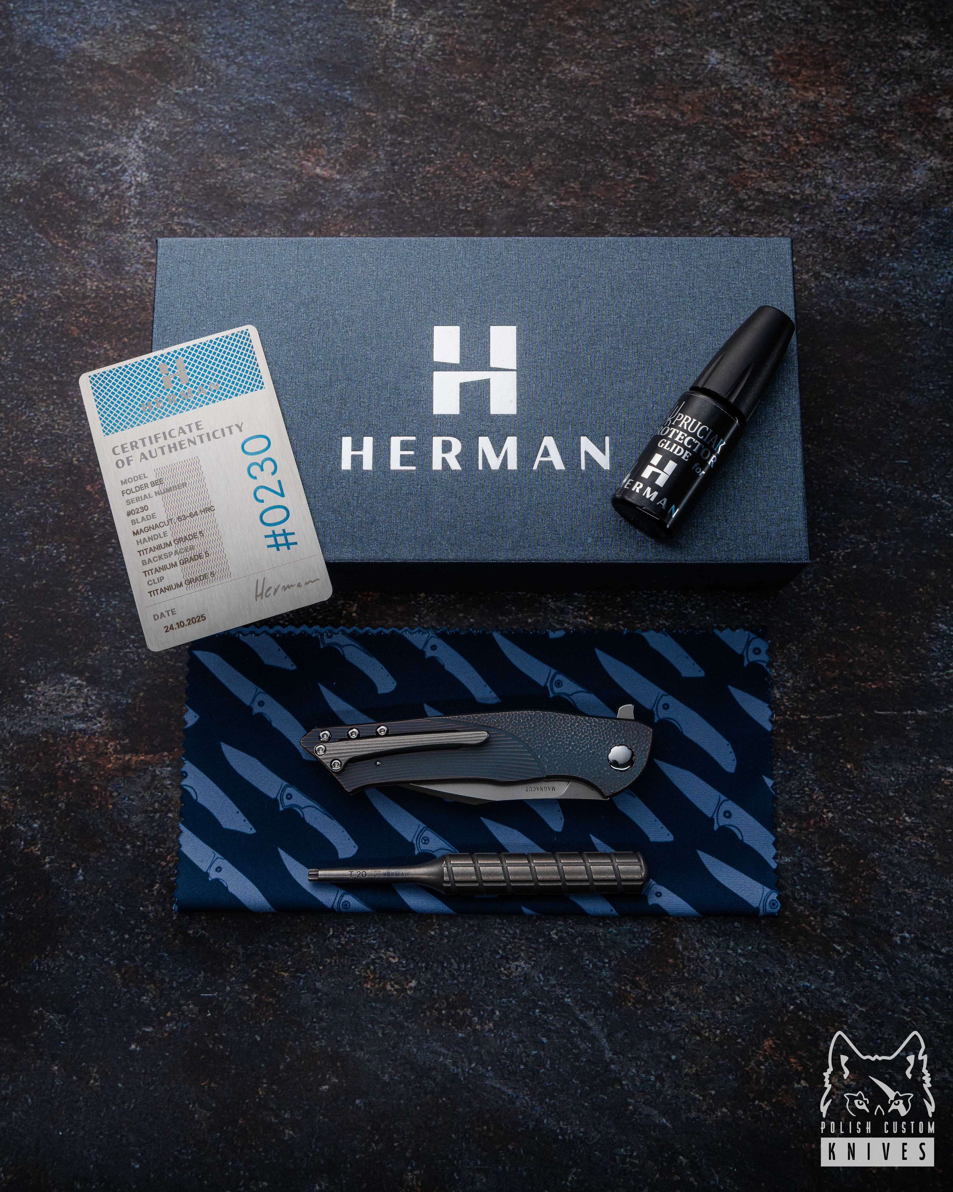 Nowe oryginalne pudełko wraz ze ściereczką oraz olejkiem Pruciak Protector Glide for Herman wraz z dedykowanym śrubokrętem ze stali nierdzewnej produkowanym przez Herman Knives.