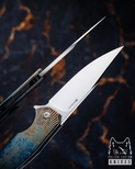 W serii Dragonfly wykorzystano różne rodzaje wysokiej jakości stali, takie jak M390, M398 od Bohler, CPM MagnaCut, Damasteel RWL34, oraz stal damasceńska od tego samego renomowanego szwedzkiego producenta, co gwarantuje wyjątkową ostrość i trwałość ostrza. Dodatkowo, w tym modelu zastosowano ostrze wykonane z Damax Alleima by Balbach, co zapewnia doskonałą wytrzymałość oraz precyzję cięcia.
