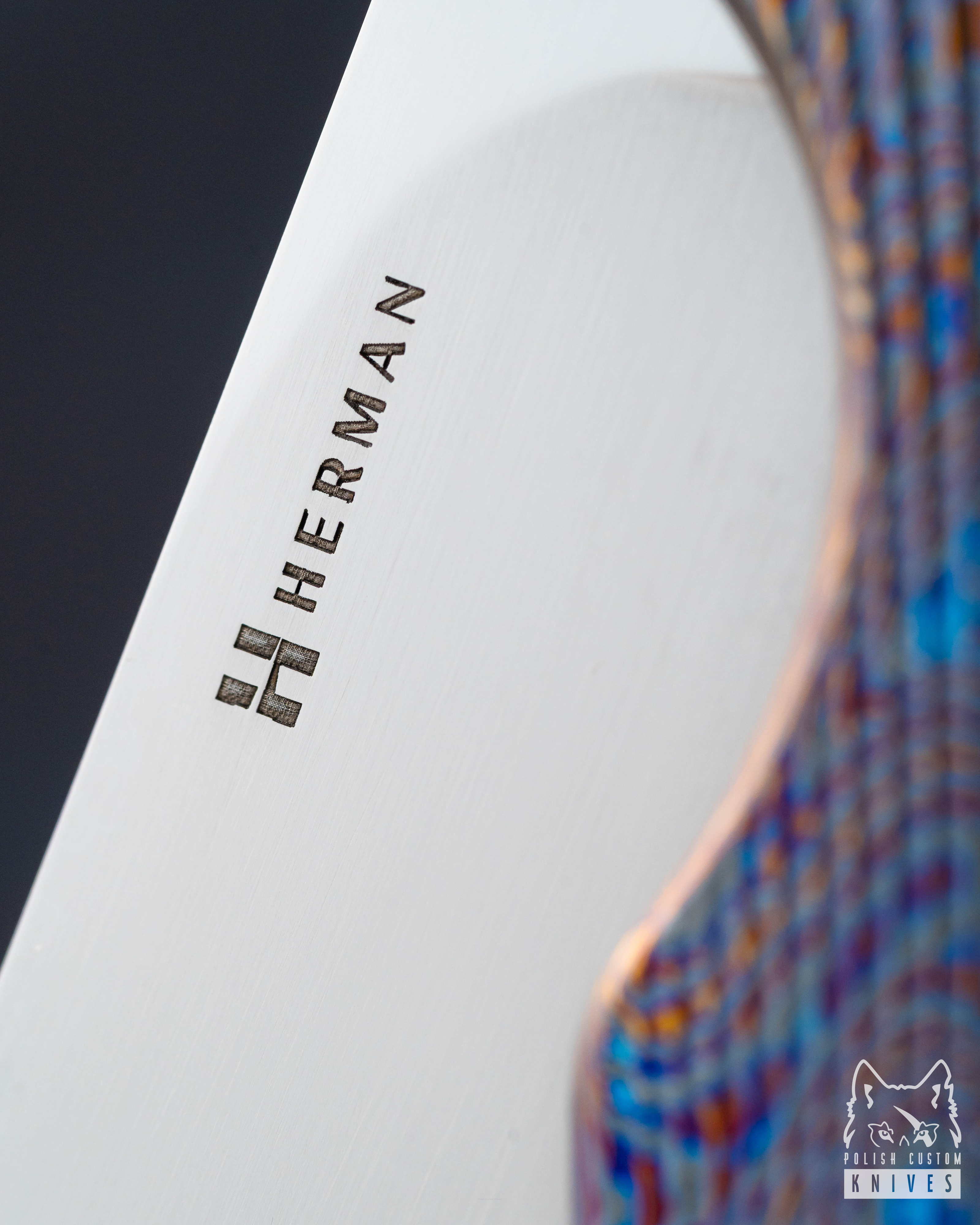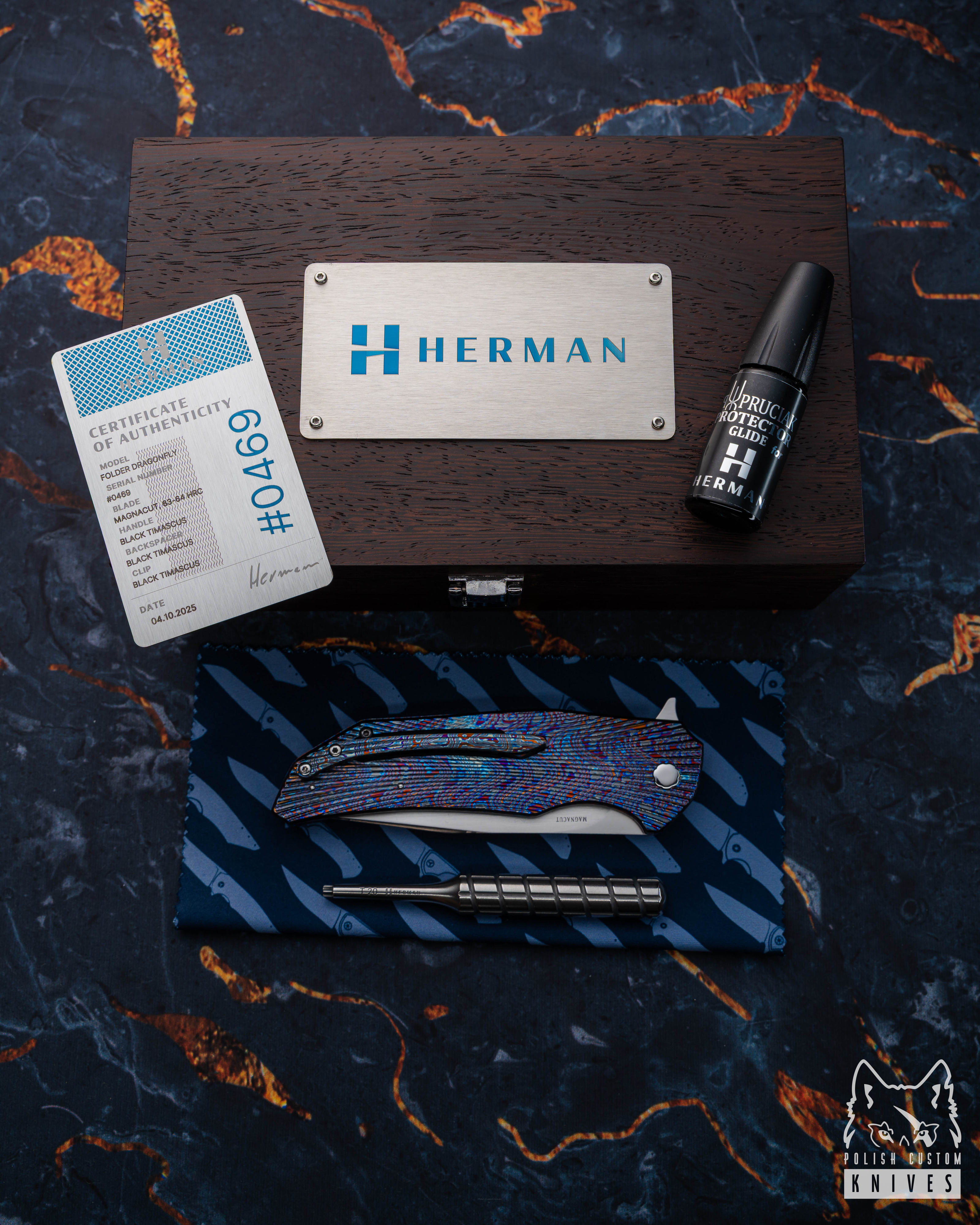 Nowe oryginalne pudełko wraz ze ściereczką oraz olejkiem Pruciak Protector Glide for Herman wraz z dedykowanym śrubokrętem z tytanu produkowanym przez Herman Knives.