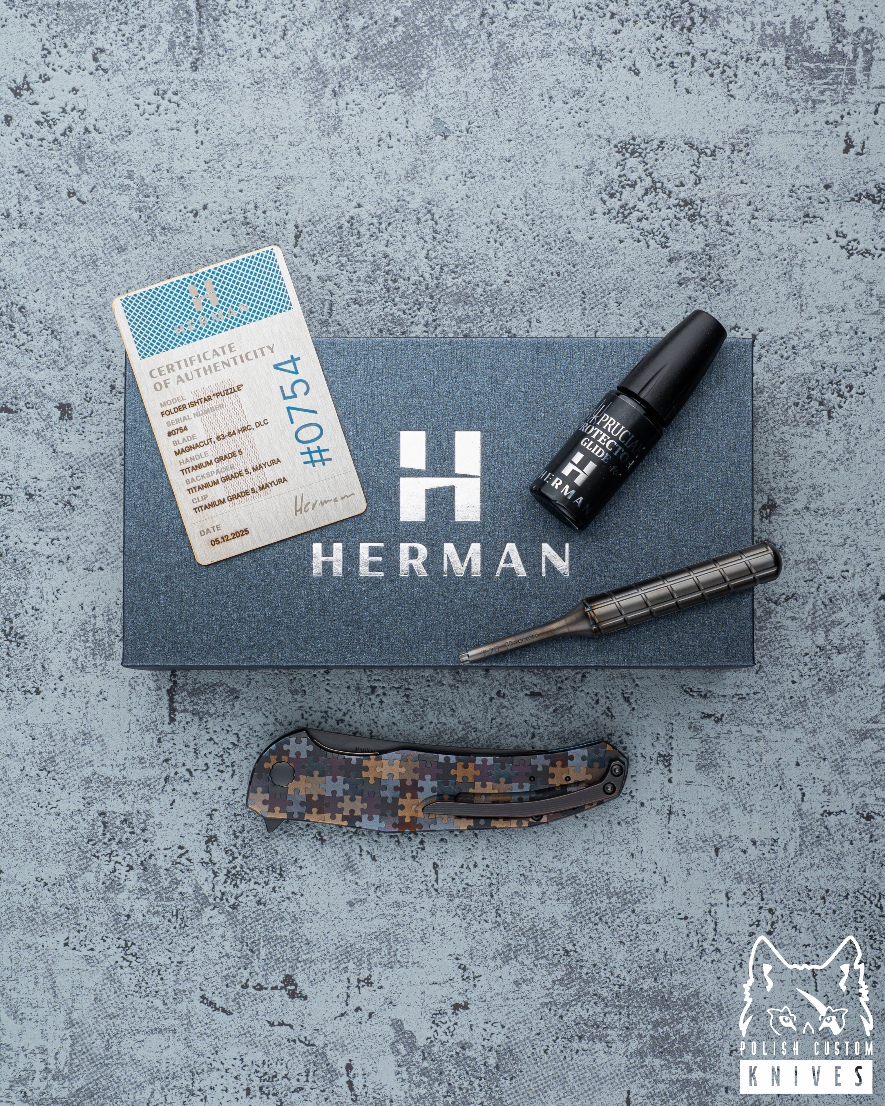 Nowe oryginalne pudełko wraz ze ściereczką oraz olejkiem Pruciak Protector Glide for Herman wraz z dedykowanym śrubokrętem z tytanu produkowanym przez Herman Knives.