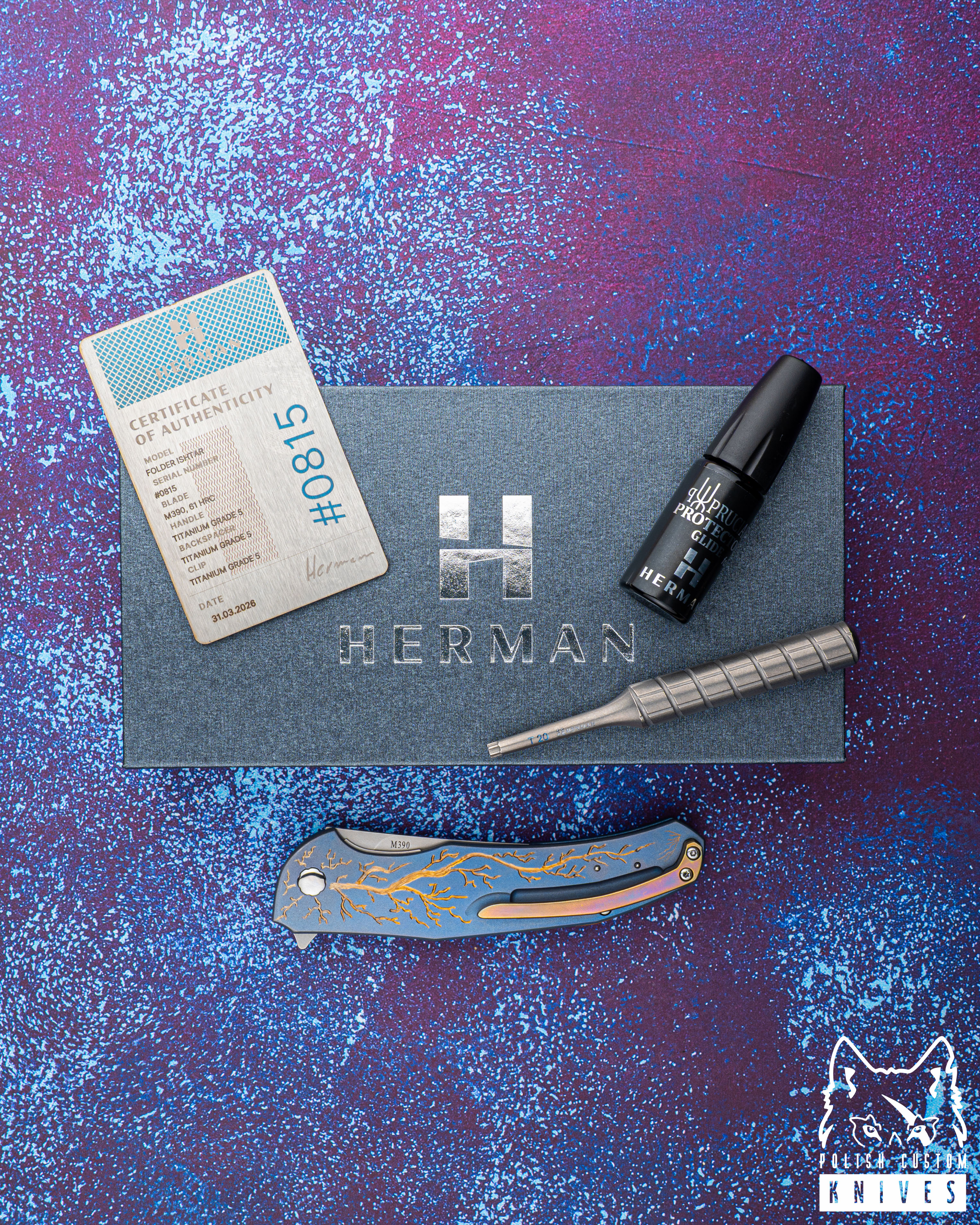 Nowe oryginalne pudełko wraz ze ściereczką oraz olejkiem Pruciak Protector Glide for Herman wraz z dedykowanym śrubokrętem z tytanu produkowanym przez Herman Knives.