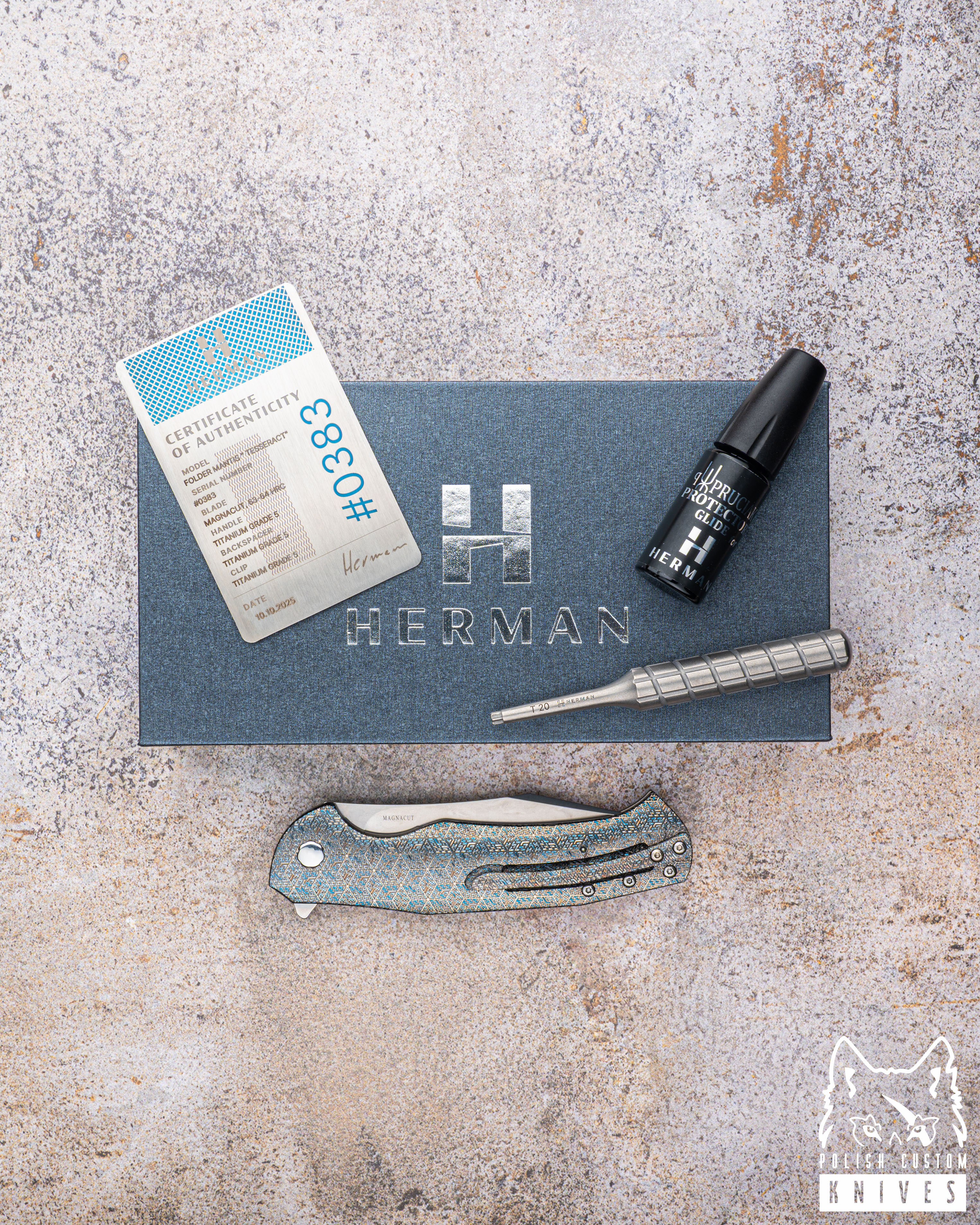 Nowe oryginalne pudełko wraz ze ściereczką oraz olejkiem Pruciak Protector Glide for Herman wraz z dedykowanym śrubokrętem z tytanu produkowanym przez Herman Knives.