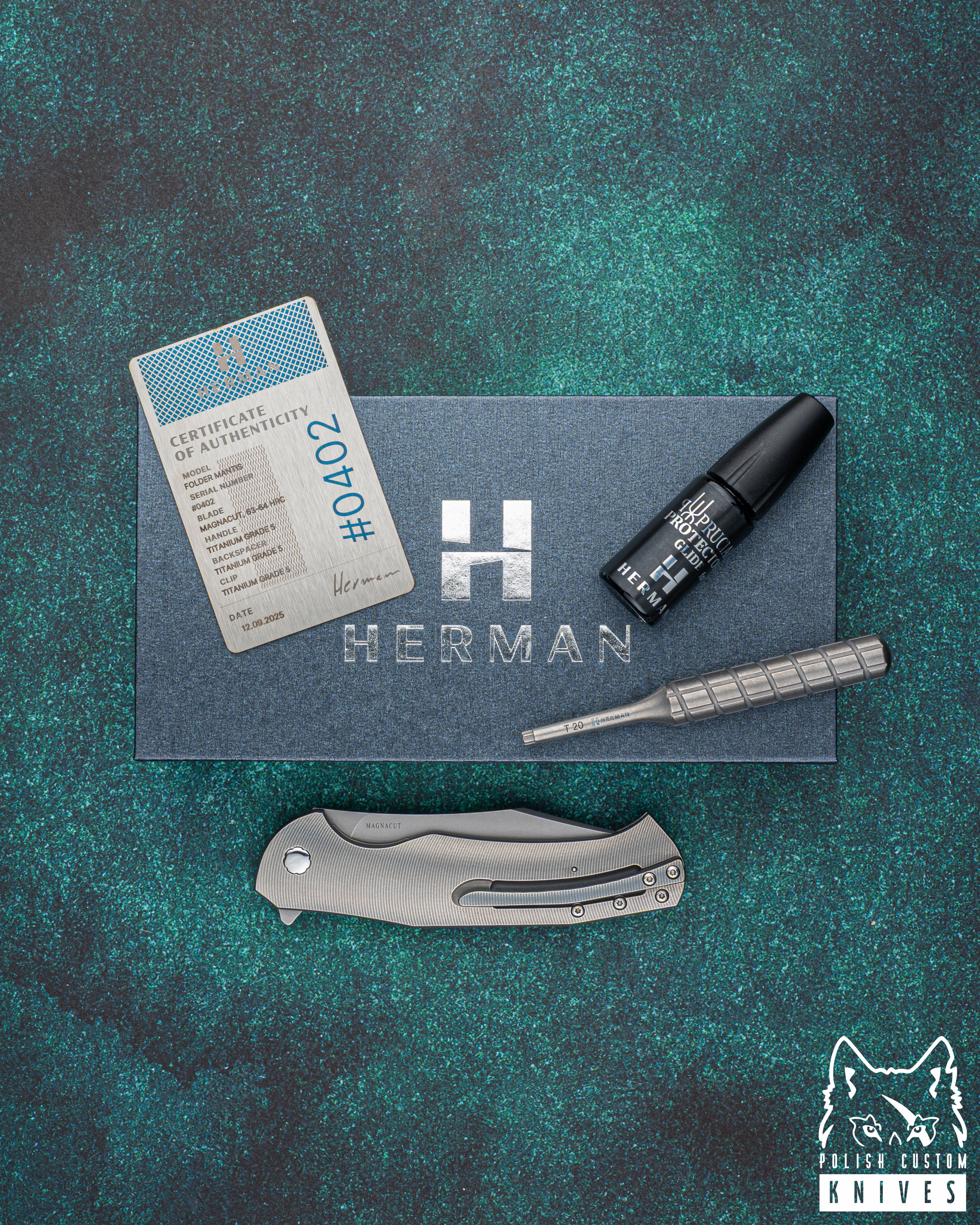 Nowe oryginalne pudełko wraz ze ściereczką oraz olejkiem Pruciak Protector Glide for Herman wraz z dedykowanym śrubokrętem z tytanu produkowanym przez Herman Knives.