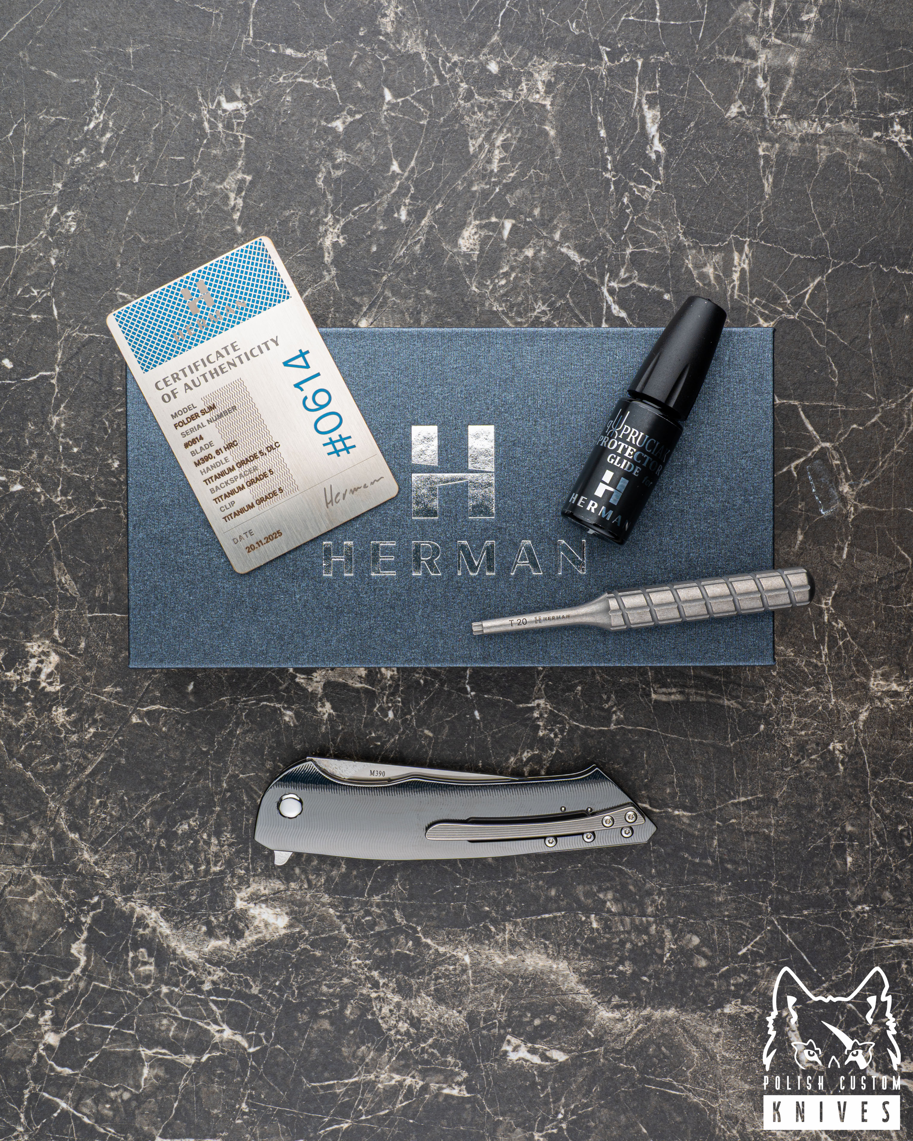 Nowe oryginalne pudełko wraz ze ściereczką oraz olejkiem Pruciak Protector Glide for Herman wraz z dedykowanym śrubokrętem z tytanu produkowanym przez Herman Knives.