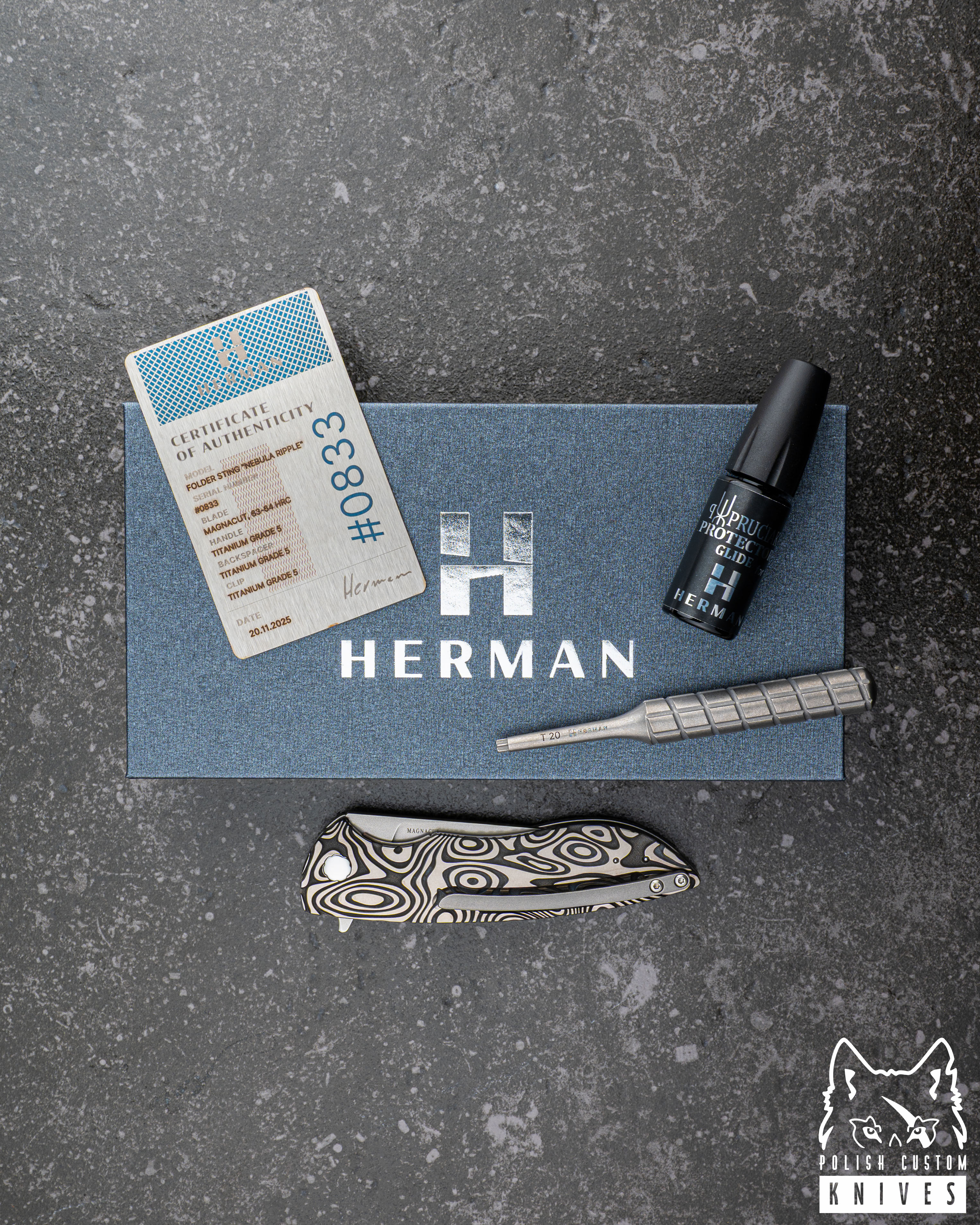 Customowy pivot Herman Knives został zaprojektowany i wyprodukowany w całości w naszej manufakturze. Konstrukcja oparta na systemie TORX T20 otrzymała nowy gwint o zwiększonej średnicy i zmniejszonym skoku, co przekłada się na wyższą precyzję oraz płynność regulacji osi noża. Rozwiązanie to minimalizuje ryzyko luzów i pozwala na stabilniejsze utrzymanie ustawień.