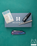 Nowe oryginalne drewniane pudełko wraz ze ściereczką oraz olejkiem Pruciak Protector Glide for Herman wraz z dedykowanym śrubokrętem z tytanu produkowanym przez Herman Knives.