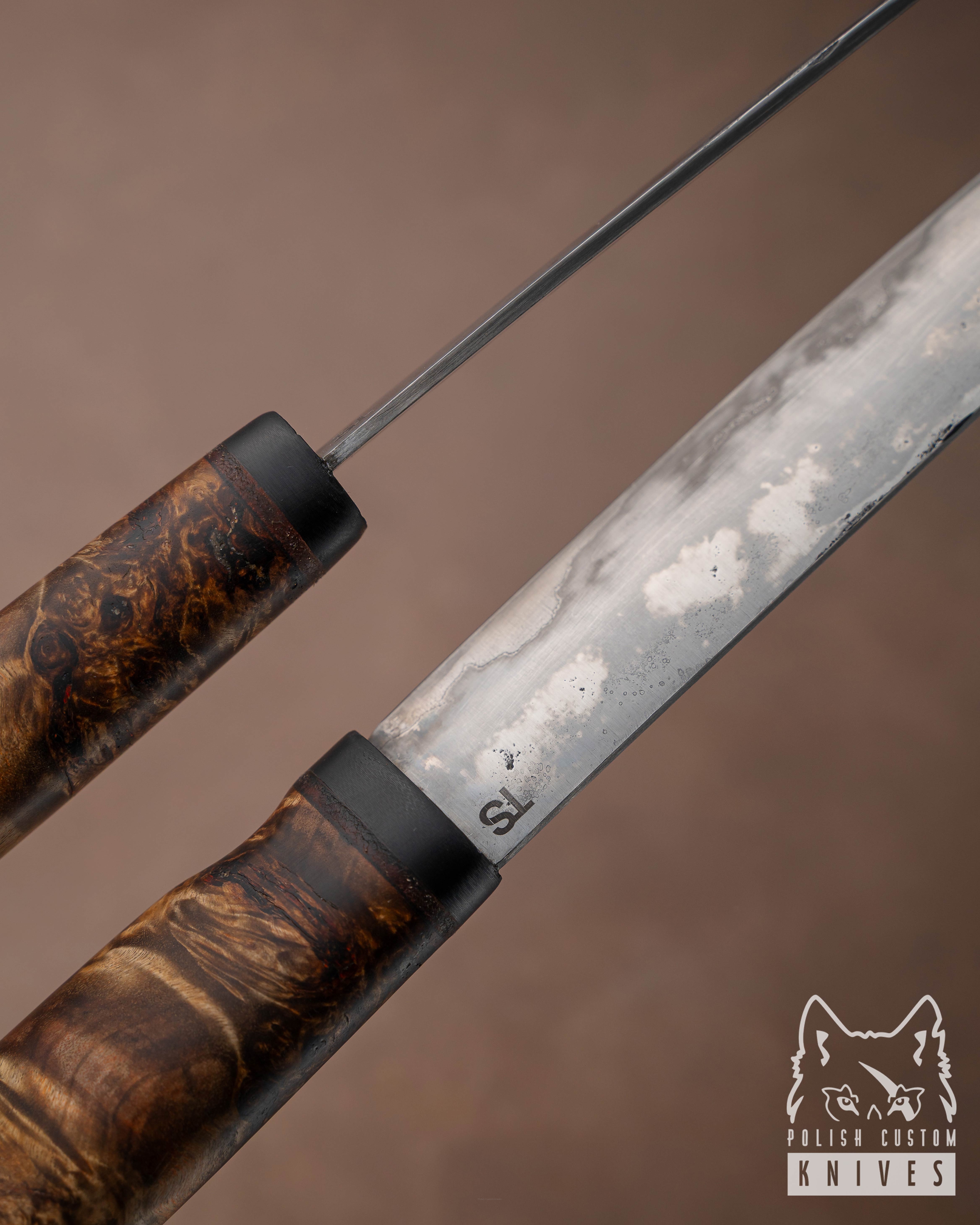 Przełom nastąpił po emisji programu "Wykute w ogniu". Gdzie zobaczyłem że ludzie żyją z wyrobu noży, po długim czasie śledzenia programu i przeglądaniu całego "YouTuba " udało się stworzyć warsztat i zacząć hobbistycznie wyrabiać noże i tak prawie 3 lata już. Najbardziej lubię robić kute noże ze stali węglowych rdzewnych (O2, łh15 ,ncv1 itp.) , lubię proste użyteczne projekty (w prostocie tkwi piękno) robię noże kuchenne jak i noże do lasu. A Od sierpnia roku 2021 wytwarzam noże na pełen etat.