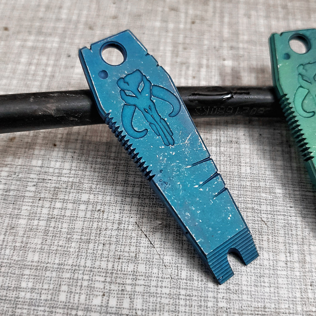 Uwaga na temat materiałów: Mosiądź jest metalem o mniejszej twardości niż tytan. Miedź jest materiałem o mniejszej twardości niż mosiądźi i materiałem o dużo mniejszej twardości niż tytan. Miedź i mosiądź, w odróżnieniu od sprężystego tytanu, odkształcają się w sposób plastyczny,dlatego nie nadają się do wykonywania narzędzi z funkcją podważania itp. Kolor miedzi i mosiądzu zmienia się z czasem w wyniku procesu patynowania.